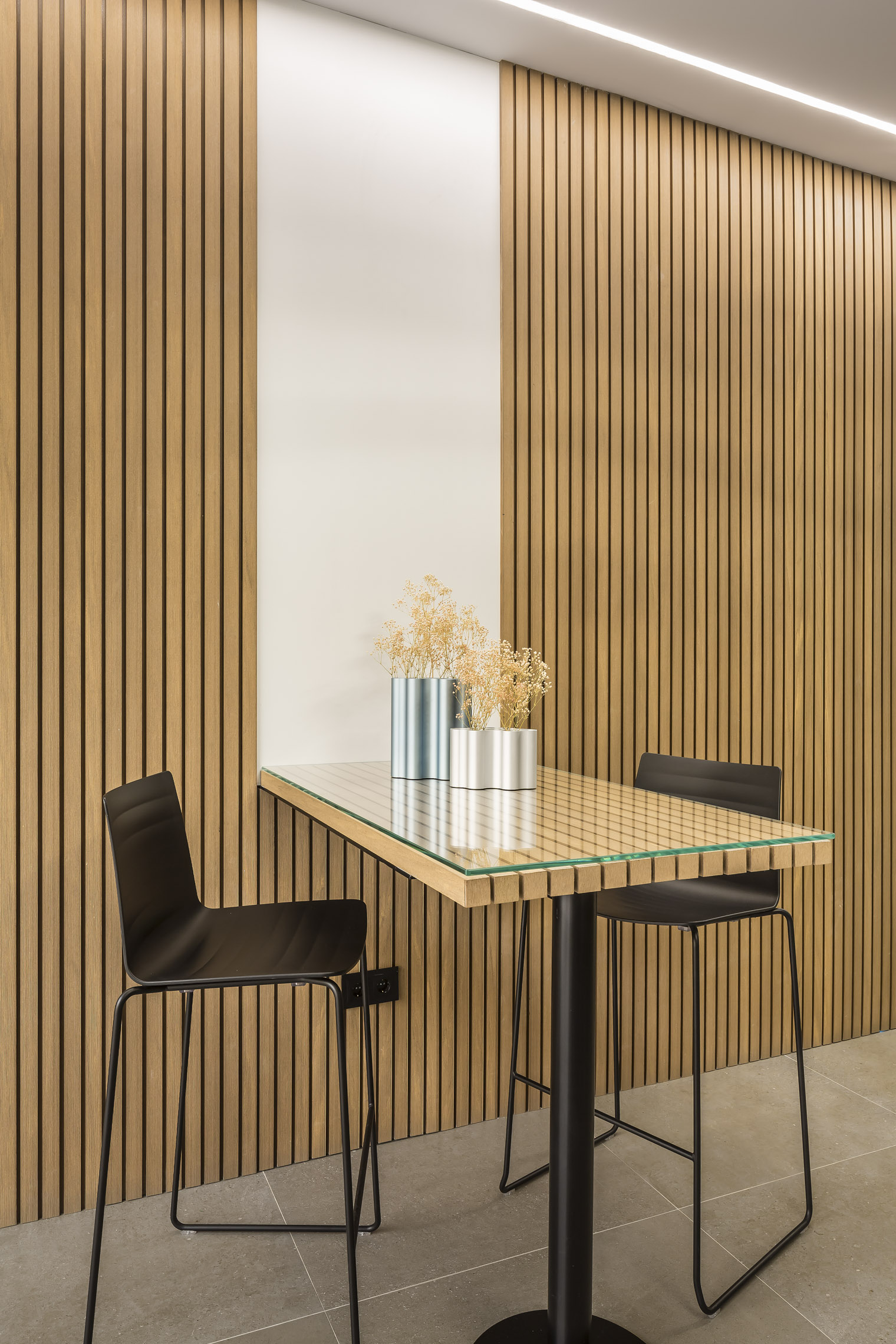 Aris Square panels were installed on key wall surfaces, creating a refined backdrop of vertical order, natural warmth, and architectural depth. The square relief adds dimension without overwhelming the space, while also contributing to built-in acoustic comfort.